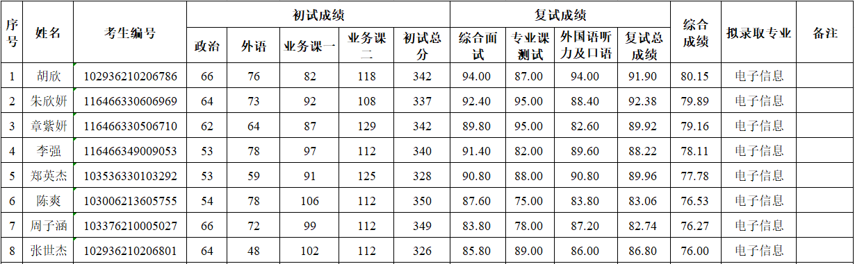备注:复试成绩=综合面试×50%+专业课测试×30%+外语听力及口语面试×20%