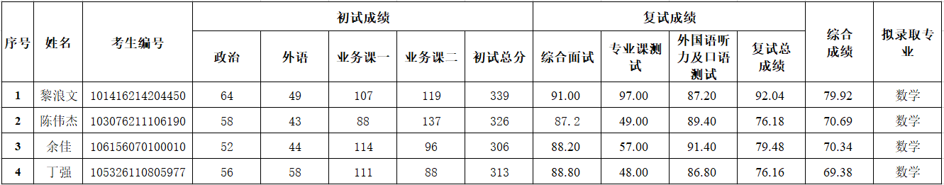 因学校统筹分配,数学专业增加一个名额。经考生初试、复试等各个环节,学院招生工作领导小组确认,现对拟录取的考生进行公示(详见下表),公示时间为2026年4月14日至2026年4月21日(七日),如有疑义,请以书面的形式反映,反映问题要实事求是,署本人真实姓名。