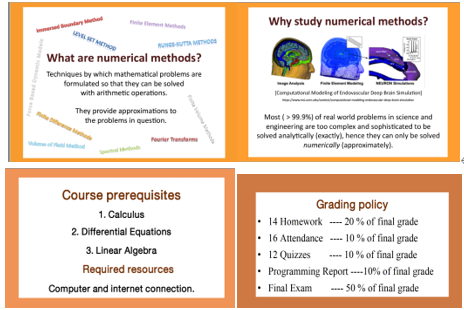 记得曾经我们理学院数学系组织的年终教学沙龙活动中,朱婉珍教授给我们青年教师作了题为“卓越教学始于教学设计”的教学讲座,使我受益匪浅。切实理会了上好一门课有“三要”:一要树立一种正确的教学观,立志做一名好教师;二要精心设计每一次课,全身心投入到教学实施;三要建立一种良好的师生关系,有效落实教学目标。线上教学亦是如此。以下是《数值计算方法(英)》第一周课程的在线教学的教学设计。