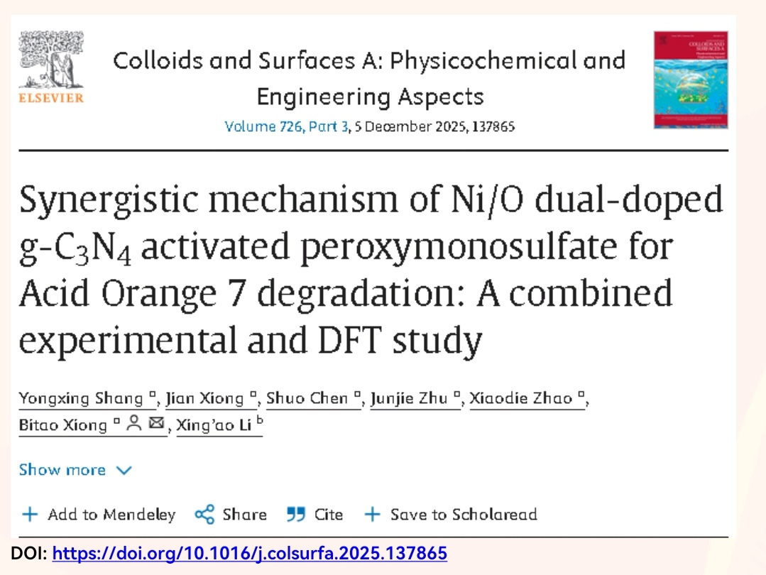 近日,我院应用物理2022级本科生商永兴以第一作者身份在《Colloids and Surfaces A: Physicochemical and Engineering Aspects》期刊上发表了题为“Synergistic mechanism of Ni/O dual-doped g-C3N4 activated peroxymonosulfate for Acid Orange 7 degradation: A combined experimental and DFT study”的科研文章。浙江科技大学为第一署名单位,应用物理系熊必涛老师为论文通讯作者。《Colloids and Surfaces A: Physicochemical and Engineering Aspects》是ELSEVIER旗下中科院分区SCI二区期刊。