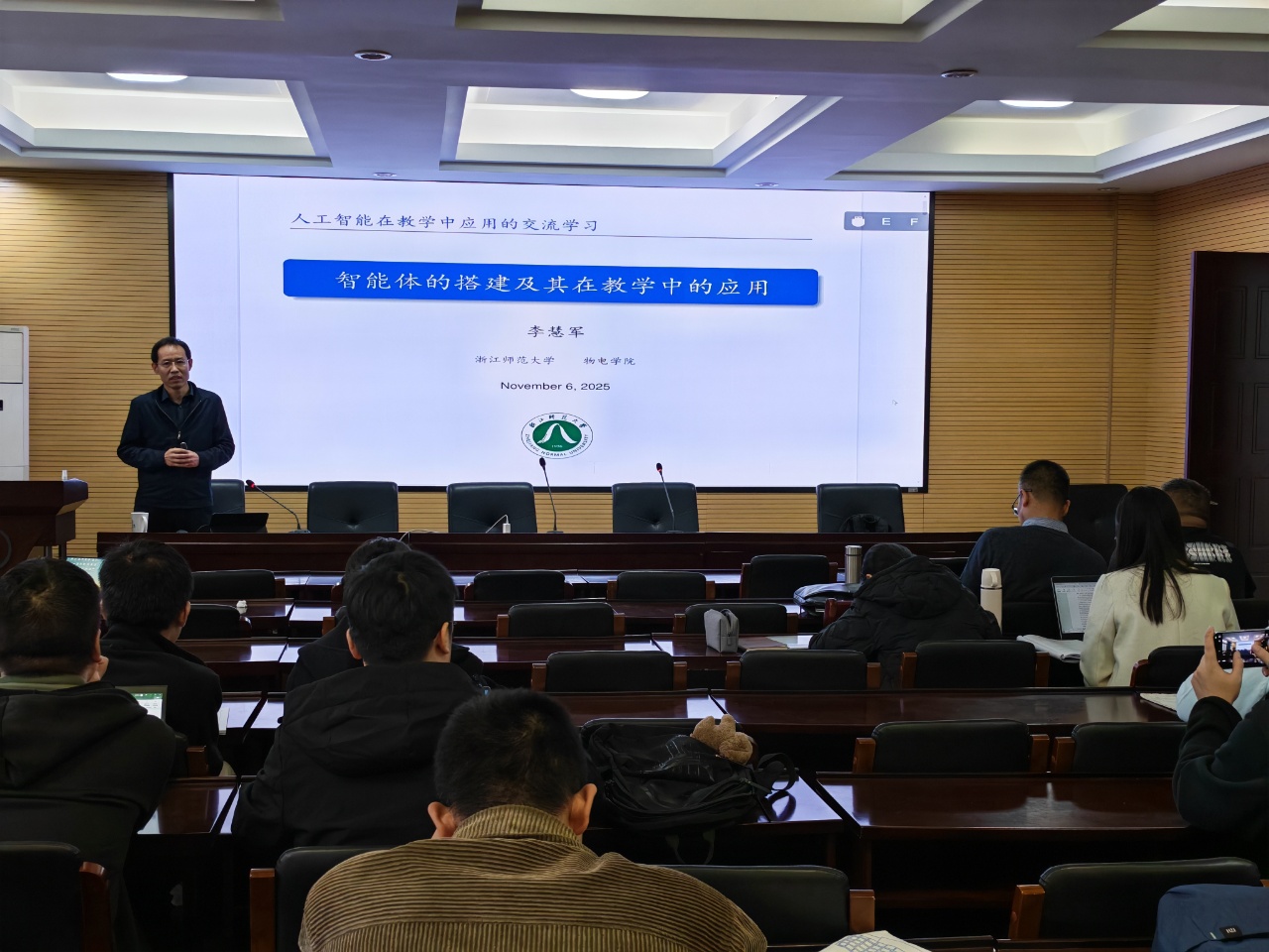 2025年11月6日,浙江师范大学物理与电子信息工程学院院长李慧军教授应邀莅临我院,在教师发展论坛上作了题为《智能体搭建及其在教学中的应用》的专题报告。本次报告聚焦人工智能技术赋能教育的前沿实践,吸引了众多教师积极参与。