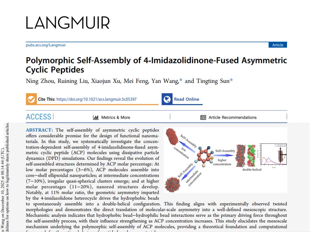 近日,理学院软物质与功能纳米材料研究团队在“不对称环肽分子自组装领域”取得重要的研究进展,相关研究成果以浙江科技大学为第一单位在国际期刊LANGMUIR(IF = 3.9,中科院SCI二区,JCR Q1)上,在线发表题目为“Polymorphic Self-Assembly of 4-Imidazolidinone-Fused Asymmetric Cyclic Peptides”的论文。物理学硕士研究生周宁为该论文第一作者,应用物理系王艳博士和孙婷婷教授为通讯作者。该研究得到了国家自然科学基金的支持。