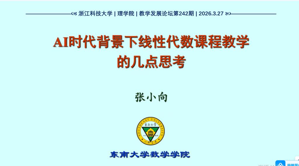 2026年3月27日下午,东南大学数学学院张小向教授应邀作了题为《AI时代背景下线性代数课程教学的几点思考》的教学论坛专题报告报告由理学院杨晓燕教授主持,理学院以及部分院外师聆听了报告。