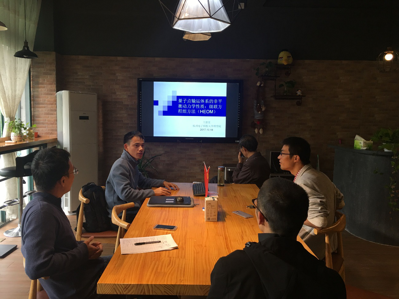 10月18日, 杭州电子科技大学理学院物理系王世宽博士应邀做客物理格致论坛第29期,做了题为“量子点输运体系的非平衡动力学性质:级联方程组方法(HEOM)”的学术报告。此次报告由骆钧炎教授主持,我院部分老师参加了本次活动。