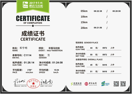 四月的江南,烟雨朦胧,春意盎然。我院邓学明老师在这美丽的季节分别参加了两场马拉松比赛,并取得了优异的成绩。4月9日参加了2017“中行杯”横店马拉松男子半程比赛,枪响成绩1小时26分14秒,在5972名参赛选手中位列44名;净成绩1小时24分08秒,在5972名参赛选手中位列50名。4月23日参加了2017扬州鉴真国际马拉松男子半程赛,枪响成绩1小时22分13秒,在9764名参赛选手中位列57名;净成绩1小时22分05秒,在9764名参赛选手中排名58。值得庆贺的是这成绩在46岁到50岁的1768名参赛男子选手中排名第3,在有2012名选手参加的中国梦排名第10。